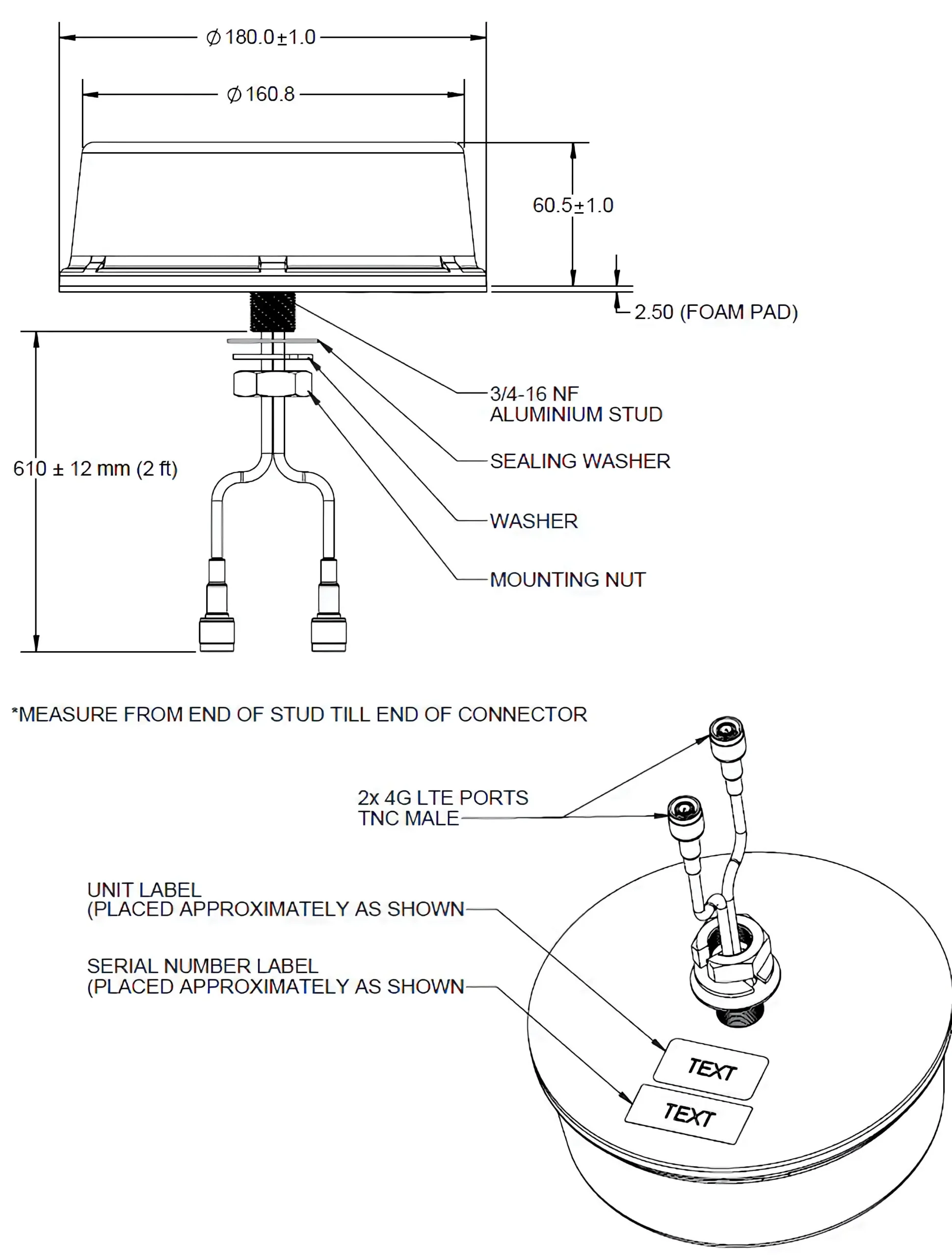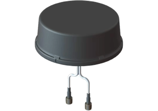 The antenna is a two port antenna with two elements designed to cover the 698-960, 1448-1511, and 1710-2700 MHz cellular bands. The antenna can be mounted on the roof of a vehicle or fixed structure. The antenna meets or exceeds a variety of environmental ruggedization specifications for transportation applications.